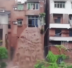 ▲洪水穿过重庆的一个居民楼,从三楼倾泻而下
