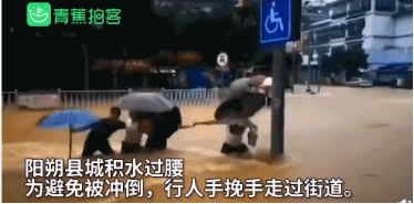 ▲广西阳朔县积水过腰,行人牵手过街道