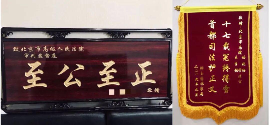 图为当事人被依法改判后向北京市高级人民法院赠送的匾额以及当事人被依法宣告无罪后向北京市高级人民法院赠送的锦旗。