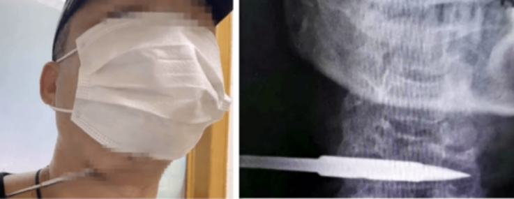 5、男子持弹弓鱼镖射鱼竟射进自己脖子近日,广东东莞的黄先生利用一种叫“鱼镖”的工具捕鱼时,不慎将镖射进自己的脖子,而这刺入颈部的镖距离大动脉血管不足1厘米。(广州日报)