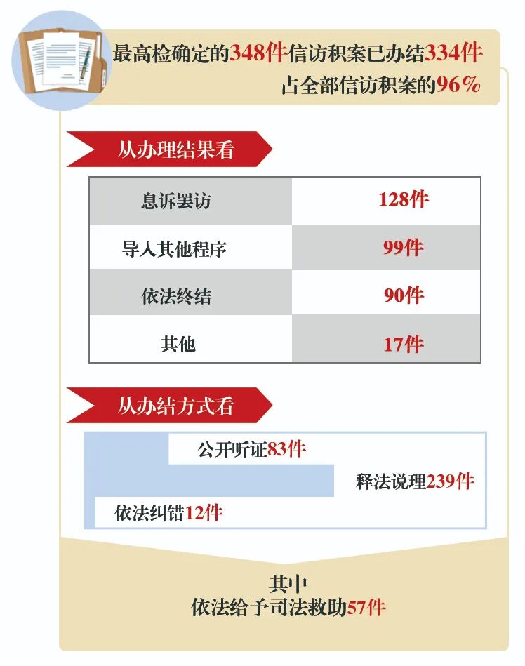 据了解,本次活动清理重点是检察机关已经作出终结性处理意见,信访人仍向检察机关重复信访五年以上且反映强烈的积案。从办理结果看,息诉罢访128件,导入其他程序99件,依法终结90件,其他17件。从办结方式看,公开听证83件,释法说理239件,依法纠错12件,其中,依法给予司法救助57件。与此同时,各地检察机关主动排查确定了1018件信访积案,同步开展清理,已基本办结。