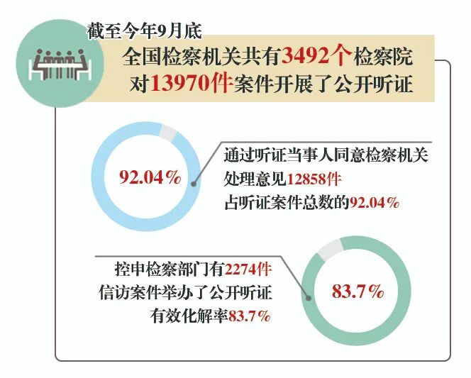 在公开听证方面,截至今年9月底,全国检察机关共有3492个检察院对13970件案件开展了公开听证,通过听证当事人同意检察机关处理意见12858件,占听证案件总数的92.04%,取得了较好的社会效果、政治效果和法律效果。控申检察部门有2274件信访案件举办了公开听证,有效化解率83.7%。