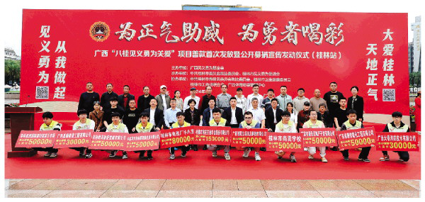 为进一步弘扬见义勇为精神,关爱见义勇为人员,传递社会正能量,引导社会公众关注支持参与见义勇为事业,4月18日,“八桂见义勇为关爱”项目善款首次发放暨公开募捐宣传发动仪式桂林站在市中心广场举行。该活动由广西见义勇为基金会主办,桂林市委政法委、桂林市见义勇为促进会承办,活动旨在大力弘扬见义勇为崇高精神,帮扶见义勇为的困难家庭,积极倡导见义勇为时代风尚,共同凝聚起向上向善、刚健朴实的精神力量。