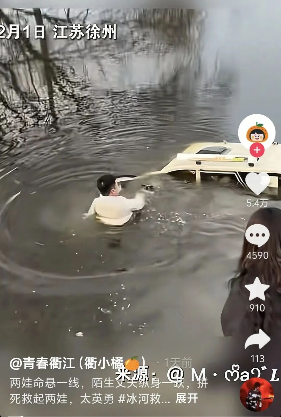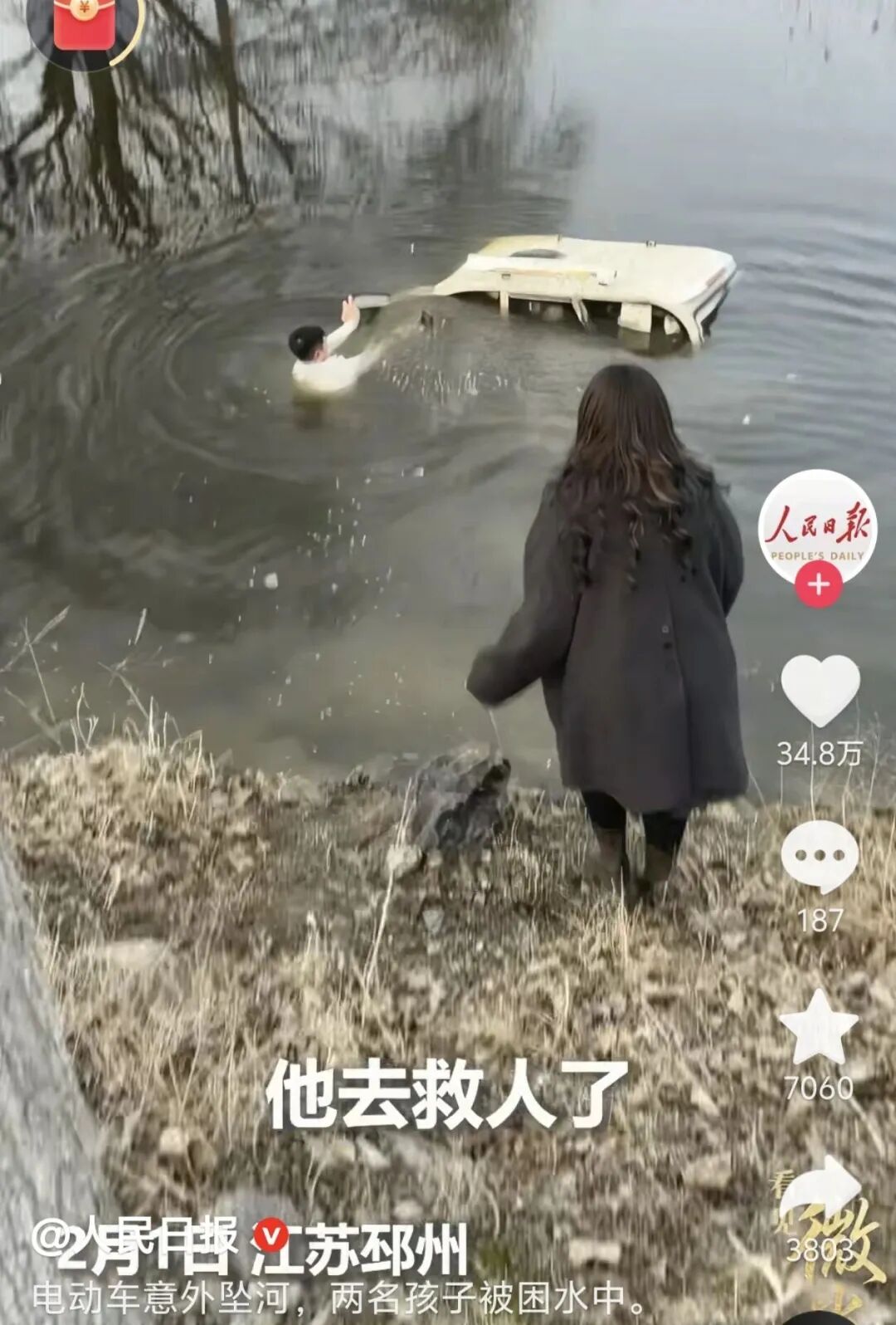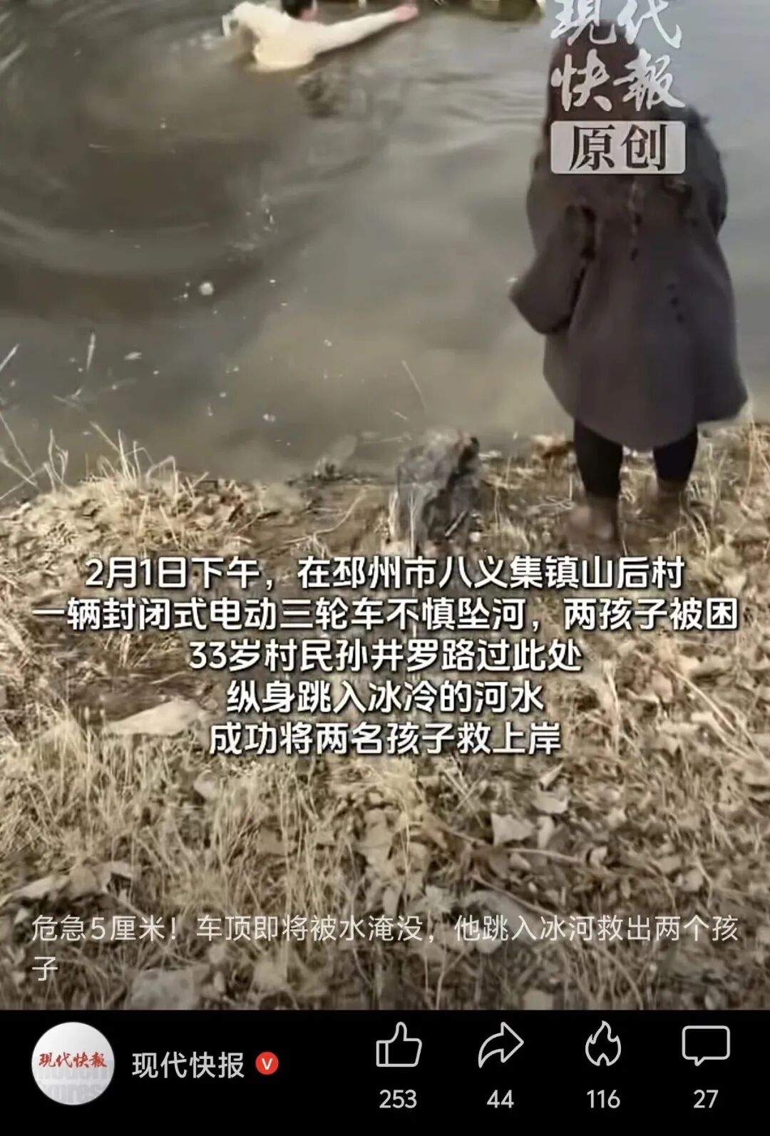 2月1日16时许,在八义集镇山后村粮窝桥头,两名人员骑电动三轮车不慎冲入河中。车辆急速下沉,生命危在旦夕。此时,驱车路过的孙井罗听到岸边群众急切呼救:“车里还有人!”他没有丝毫犹豫,迅速停车冲向河岸。