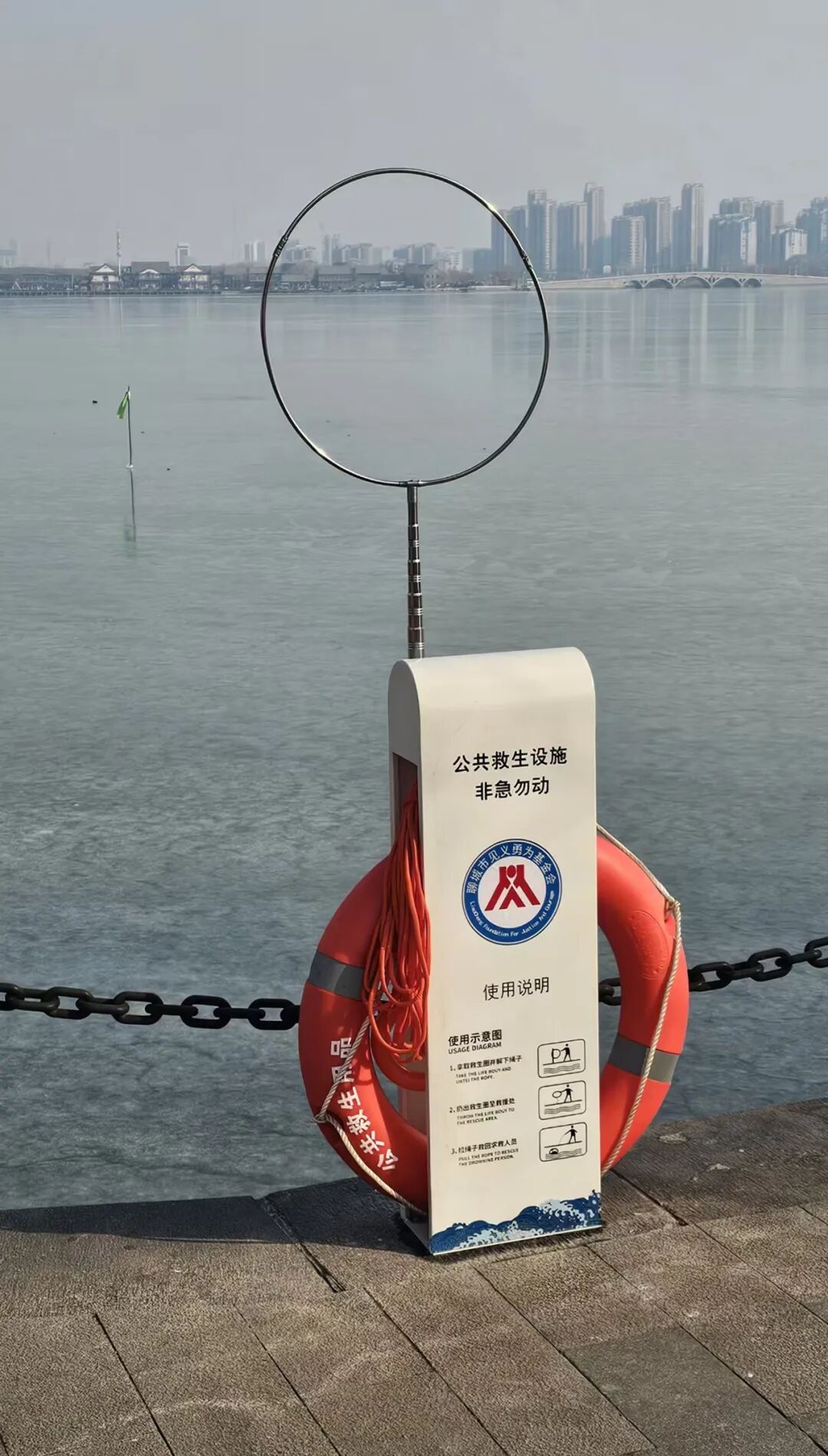 聊城被誉为“江北水城、两河明珠”,水域资源丰富,溺水安全隐患始终是群众关切的焦点。市见义勇为基金会调研发现,全市见义勇为行为百分之七十以上为救助溺水人员,为此,他们筹集资金10余万元,在东昌湖、京杭运河城区段沿岸统筹布设救生圈、救生绳、救生杆等276套救生设施,为意外落水者搭建“生命通道”。同时,积极向各级党委、政府呼吁,由政府部门按照属地管理原则,在河湖沿岸布设救援设施,方便市民在紧急情况下快速取用施救,既能抢抓黄金救援时间,又能降低施救者自身风险,得到各级党委、政府的大力支持。