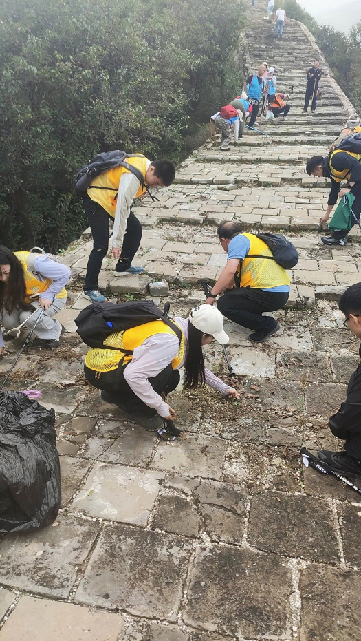 “青行万里”服务队队员和志愿者们清除长城上的杂草。