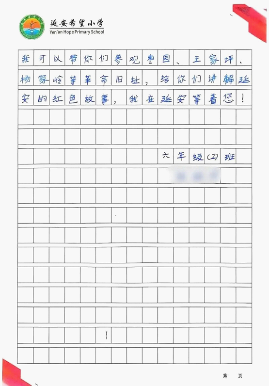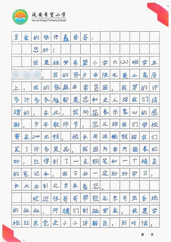 “张佟鑫做事很低调,默默去做不愿张扬。他从部队到地方,工作虽然转变,那份爱心一直都在。”周三红说,今年在接到张佟鑫的信之后,她代表学校向北京市司法局写信表达感谢之情,“我们一名六年级学生也向张佟鑫写了一封信致谢,邀请他和司法局的同志们到延安来参观,孩子们还要给北京的叔叔阿姨讲延安的红色故事呢。”