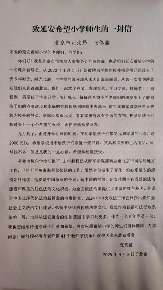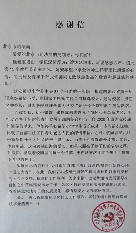 2025年9月10日,第41个教师节到来之际,北京市司法局收到了来自延安希望小学全体师生的一封对青年党员干部张佟鑫的感谢信……
