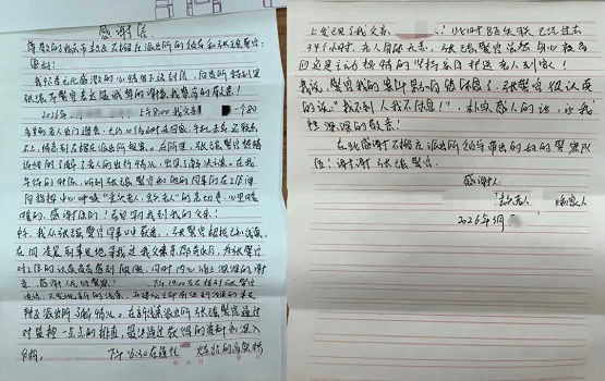 经过一天一夜的搜寻,终于找到了失联的老人。看到老人身体无碍,张瑶悬着的心也落了地。他护送老人平安归家与家人团聚,原本焦急万分的一家人,终于露出了安心的笑容,对民警的感激之情溢于言表,还特意手写了一封感谢信。