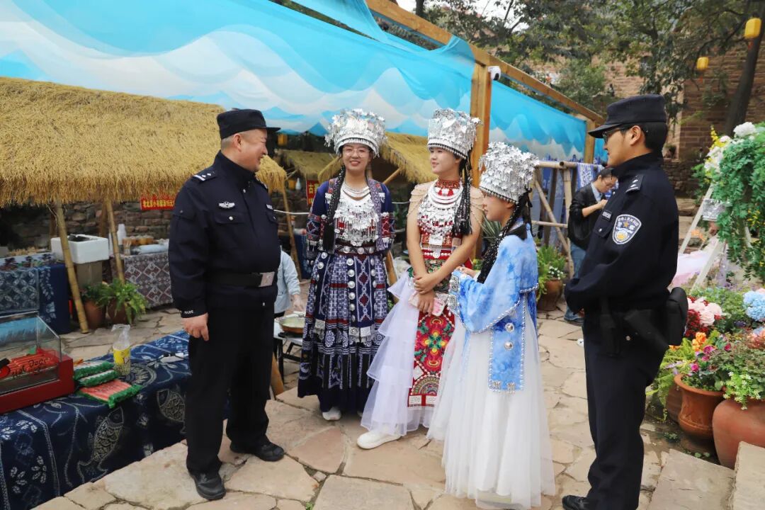 穿过苗饰广场,拾阶而上,石板路两旁,石墙石屋在各色花束的点缀下,古韵新潮、典雅浪漫,尽显传统与现代的交融之美。“警察同志,八路军总部旧址、冀南银行展馆在哪?我们想了解一些历史文化知识。”在美食小广场,三名身着苗族服饰的少女正在咨询路罗派出所民警。面对游客求助咨询,派出所民辅警们化身旅游“推荐官”“服务员”,总是热情地帮助回答。