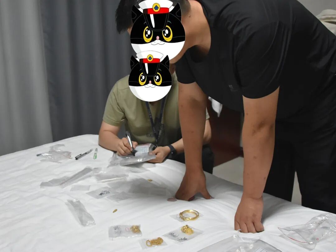 7月5日凌晨,民警展开突袭,将睡梦中的犯罪嫌疑人林某甲(男)、林某乙(女)成功抓获,当场查获“金项链”3条、“金手镯”2只、“金戒指”2个、“金耳环”1对以及作案工具若干。