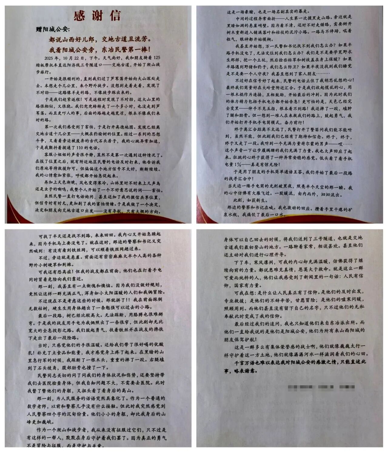 后来,葛先生在感谢信里写道:“手机剩余1%的电量,行囊仅剩的最后一口水、深夜里手电筒的光,是最深刻又温暖的记忆!以前和警察几乎没有接触,此刻却感受到‘人民警察’四个字的分量,他们小小的身躯,比身后的山峰更加巍峨!”