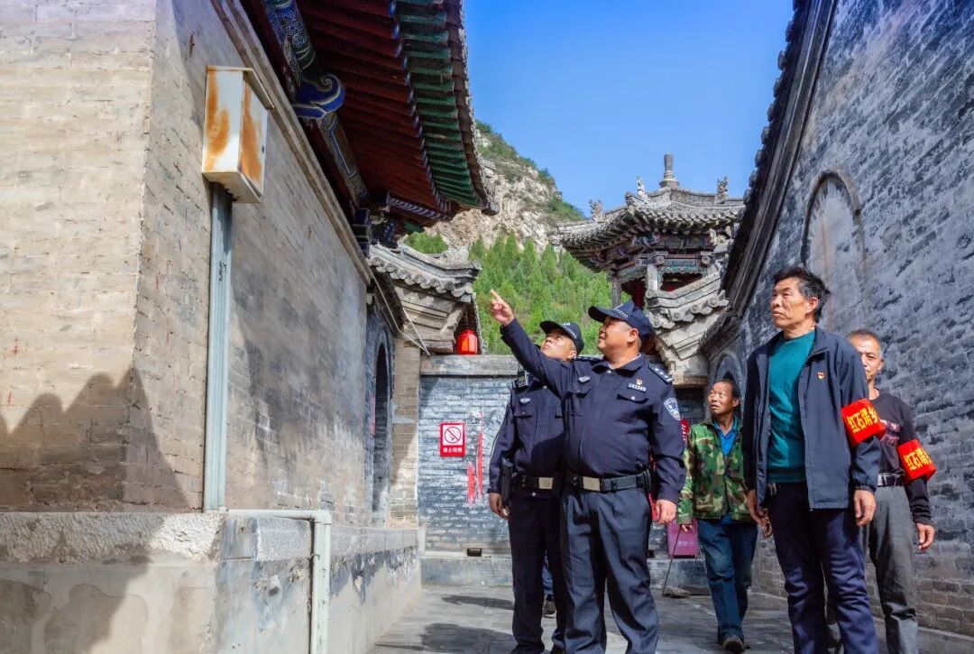 大同市灵丘县公安局红石塄派出所民警辅警联合治保会在觉山寺景区联合检查安全隐患。