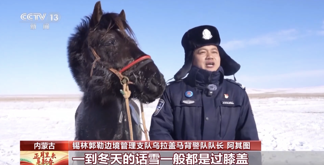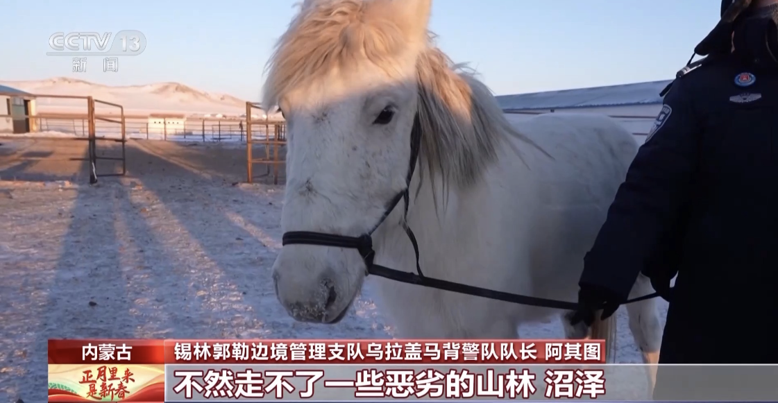 锡林郭勒边境管理支队乌拉盖马背警队队长阿其图:今天是春节之前最后一次巡逻。出发之前一定要检查好这个马鞍子,把肚带一定紧好。还有这小白马今天跟着我们第一次巡逻,互相照顾好,要注意安全。