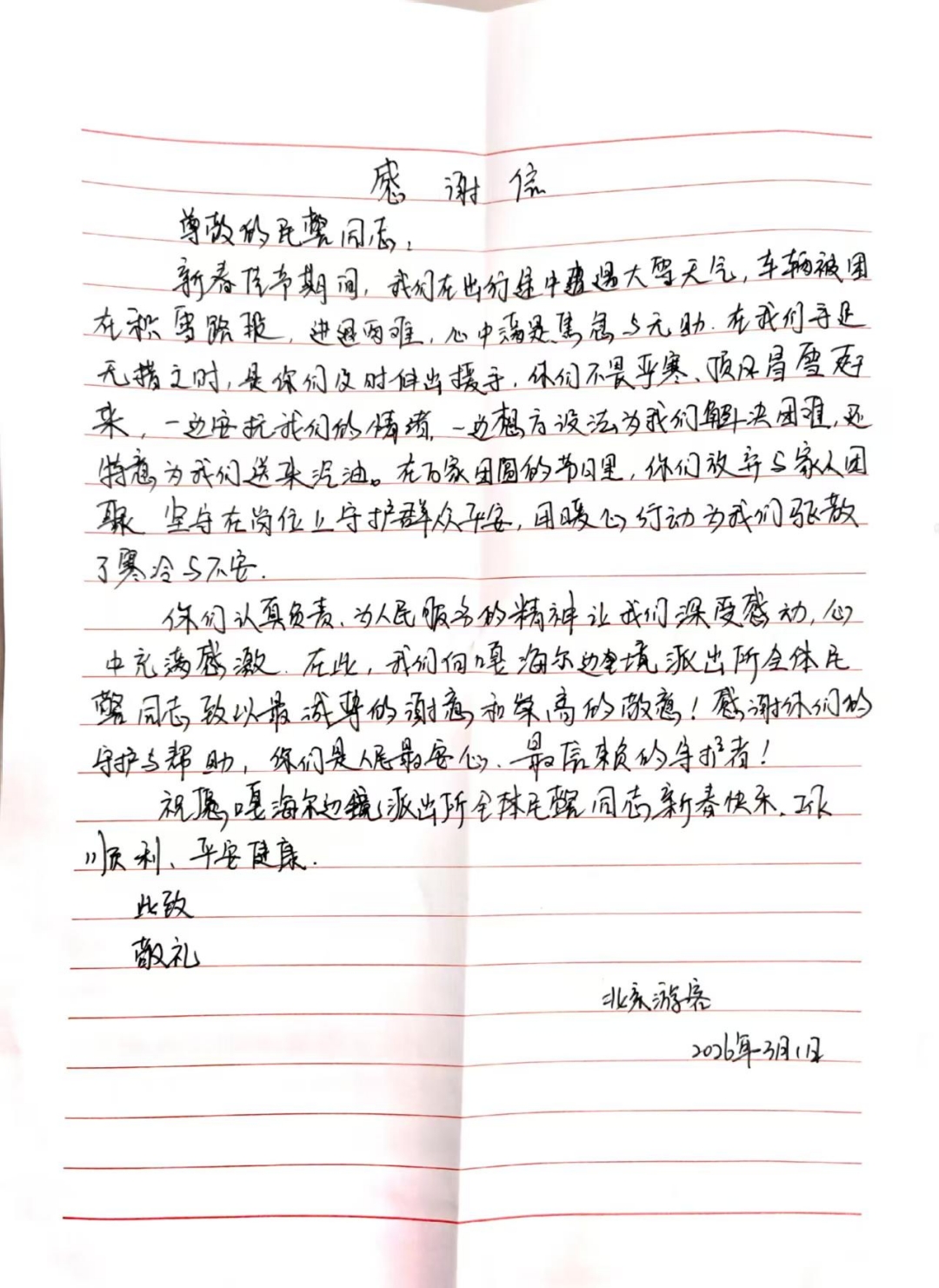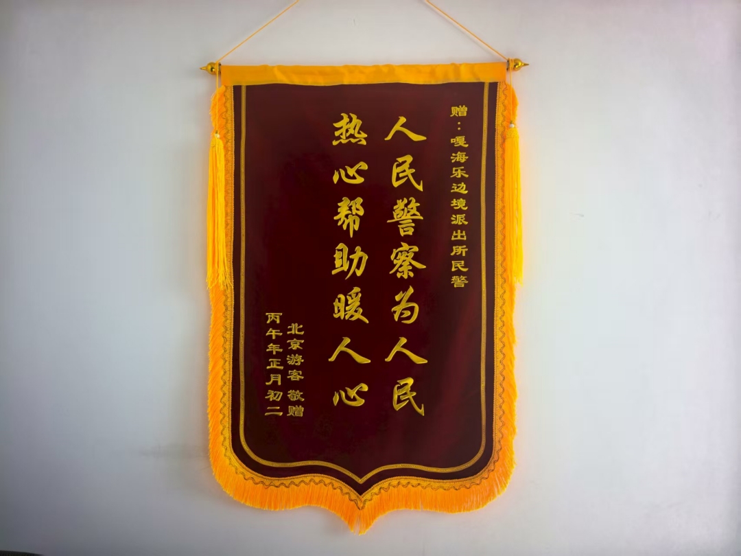 时隔一个月,锦旗和感谢信从春暖花开的北京寄到了积雪渐融的边境。赵先生在信中写道:“在万家团圆的节日里,你们放弃与家人团聚,坚守在岗位上守护群众平安,用暖心行动为尾门驱散了寒冷和不安。”