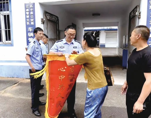 郑亮(中)及时破获交通肇事逃逸案,伤者家属向其赠送锦旗