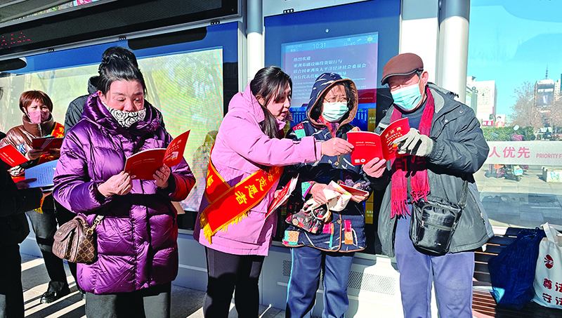 作为日均170台公交车经停、2000人次乘降的交通枢纽,市人大公交站是此次智慧普法的“样板”。寒风中,盘锦市司法局工作人员与来自盘锦市国资委、盘锦客运公交集团的青年志愿者们裹着厚羽绒服,胸前的“普法宣传”绶带格外醒目。他们手中的宣传品暗藏巧思:红彤彤的《中华人民共和国宪法》《中华人民共和国法治宣传教育法》读本封面上印着便民咨询二维码;印着“尊法学法守法用法”字样的帆布购物袋里,还装着印有法律小知识的书签。