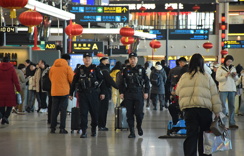 2月2日一早,沈阳桃仙机场航站楼二楼出发大厅已是人头攒动。红灯笼挂在柜台前,“福”字贴在玻璃上,映着旅客的行色匆匆。在这片略显嘈杂的繁忙之中,一抹抹藏蓝身影默默守护着现场的秩序和旅客的平安。