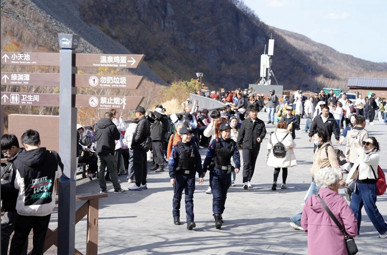 澄澈的天池、斑斓的林海、磅礴的瀑布……被誉为“关东第一山”的吉林省长白山尽情展现着秋日的瑰丽;游客涌动在蜿蜒的栈道上拍照流连,接驳车满载着期待与赞叹在山路间往复穿行……尽管游客络绎不绝,但在民警和工作人员的引导下,现场秩序井然。