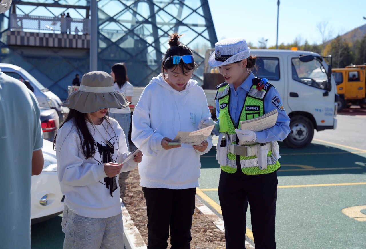 10月2日,池北区西出入城口的晨雾渐渐散去,长白山公安局池北交巡警大队民警辅警们便忙碌了起来。这里是G331公路的重要节点,民警们在摆放好宣传展板后,主动走向一辆辆途经的车辆。一句句“欢迎来到长白山”的亲切问候,伴随着递上的印有安全提示的矿泉水,和那句必不可少的暖心提醒:“前方山路多弯,请您减速慢行,祝您旅途愉快!”如同秋日里的暖阳,洒进了南来北往游客的心中。