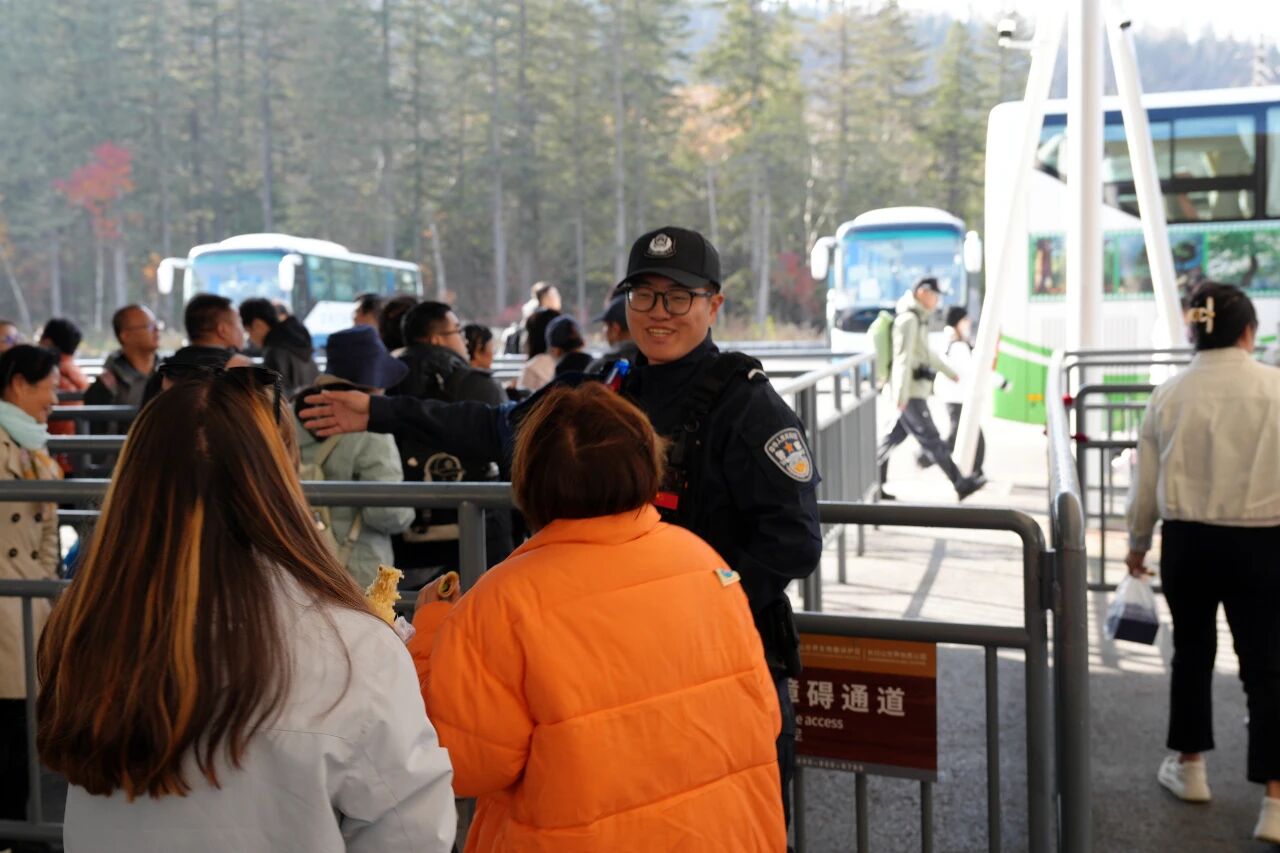 如果说G331是串起沿边风景的“珍珠项链”,那么长白山景区便是这项链上最夺目的一颗。当天中午,长白山北景区天池换乘中心人流如织,光明森林派出所旅游警务管理队的民警辅警们正穿梭于密集的游客之间,熟练地维护秩序、疏导客流、解答问询。