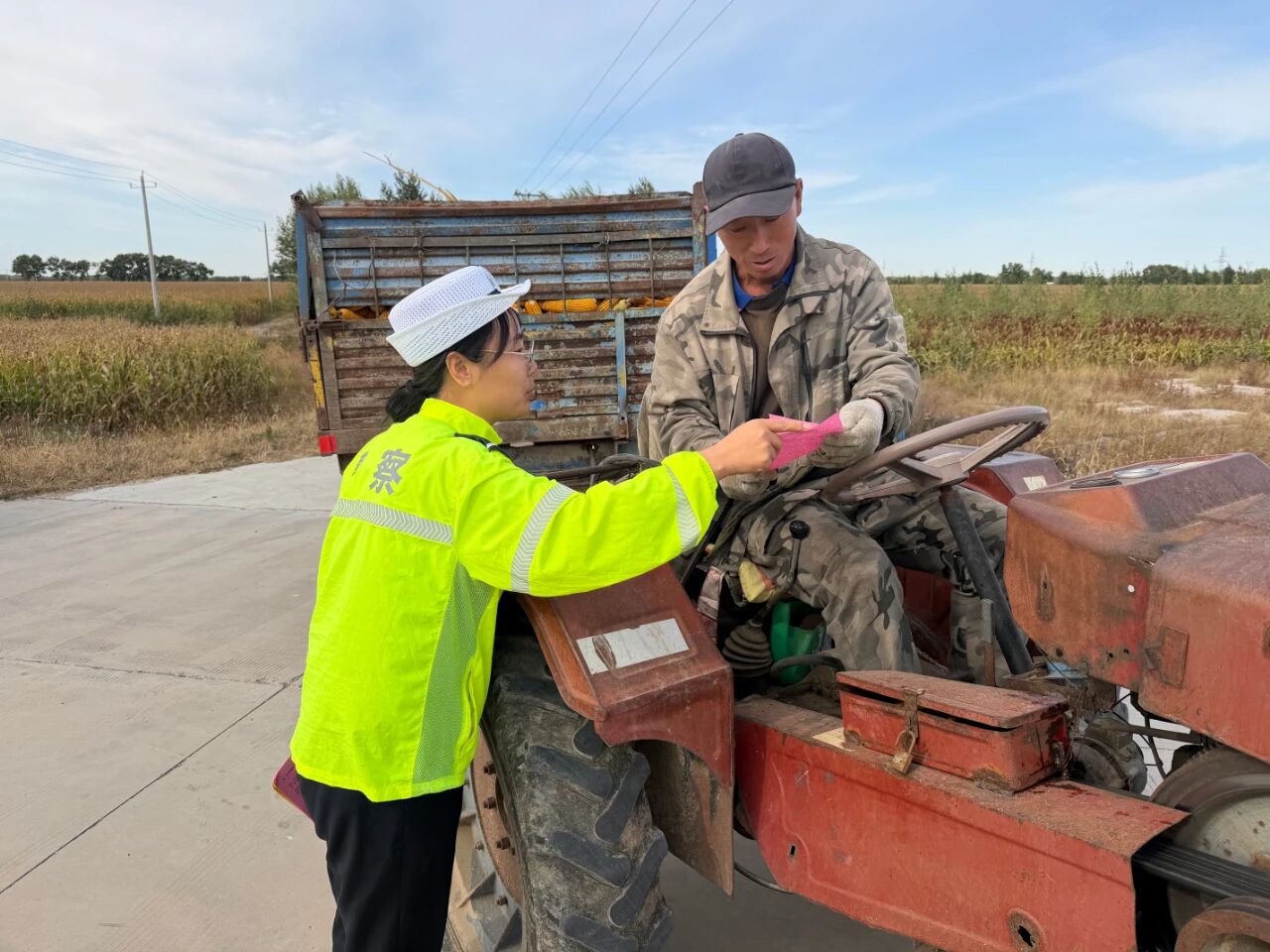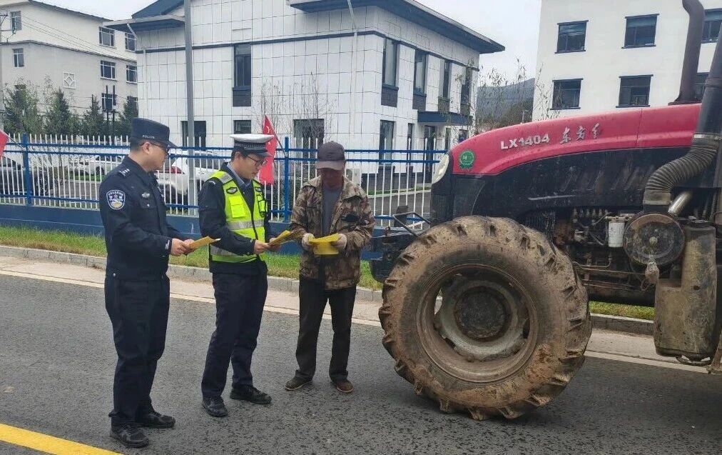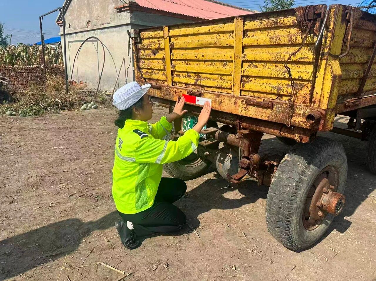 民警深入乡镇、村社,对参与秋收作业的农用车辆、驾驶人员进行摸底登记;为无反光标识或反光标识残缺的农用车辆免费粘贴反光贴;严查严控农用车违法载人、货车超载、面包车超员载客等重点违法行为。同时他们还向农民朋友宣传交通安全法律法规和秋收时节出行注意事项,全力提升广大村民道路交通安全意识,引导群众规范出行、谨慎驾车。