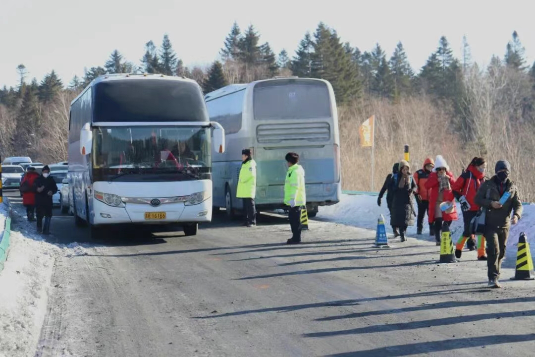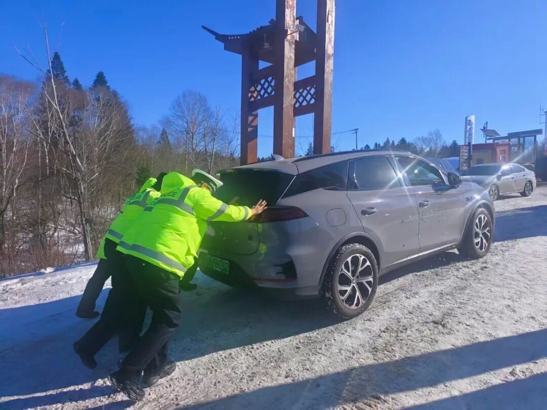 交通管理大队坚持“安保+服务”并重,将游客急难愁盼放在心上,在做好交通安保的同时,全力提供应急救助、失物招领等暖心服务。期间,一名外地游客因不熟悉路况,驾车误入积雪较深的林区支线,车辆陷入积雪无法动弹。接到求助后,执勤民警迅速携带救援工具赶赴现场,顶着零下二十余度的严寒,奋力开展救援作业,最终成功帮助被困车辆脱困。“多亏警察同志及时援手,不然在这冰天雪地里真不知道该怎么办!”游客握着民警的手连连致谢。