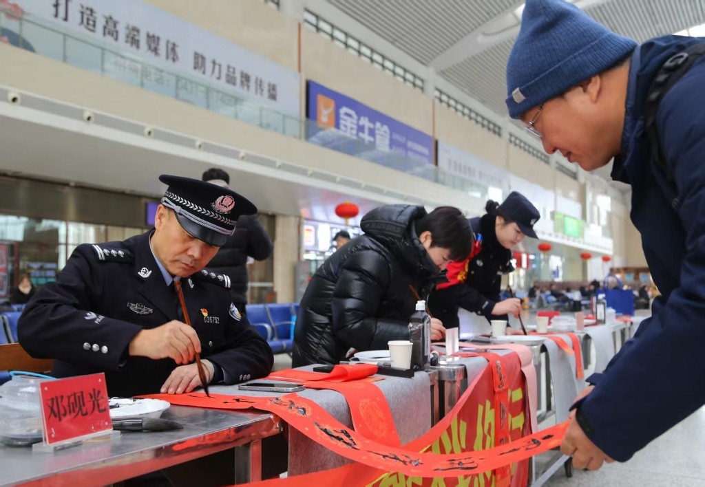 “福字拿好,路上注意安全!”2月2日清晨,天刚蒙蒙亮,吉林长春火车站候车大厅里已经飘起了墨香和笑语。记者刚走进大厅,就被一阵热闹的吆喝声吸引——沈阳铁路公安局长春公安处的民警们正围着一张长桌忙得不亦乐乎,红通通的春联纸铺满了台面,墨汁的清香混着东北清晨的凉气,扑面而来。