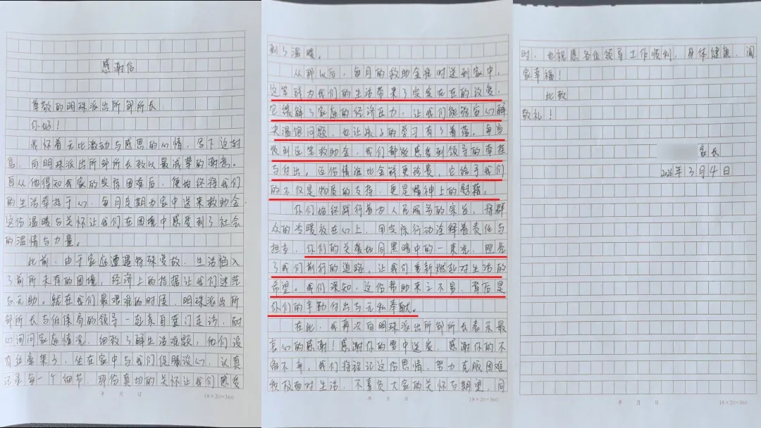 信里有这样一段话:“这笔钱为我们的生活带来了实实在在的改变,它缓解了家庭的经济压力,让我们能够安心解决温饱问题,也让孩子的学习有了着落。每当收到这笔救助金,我们都能感受到领导的牵挂与付出。这份情谊比金钱更珍贵,它给予我们的不仅是物质的支持,更是精神上的慰藉。”