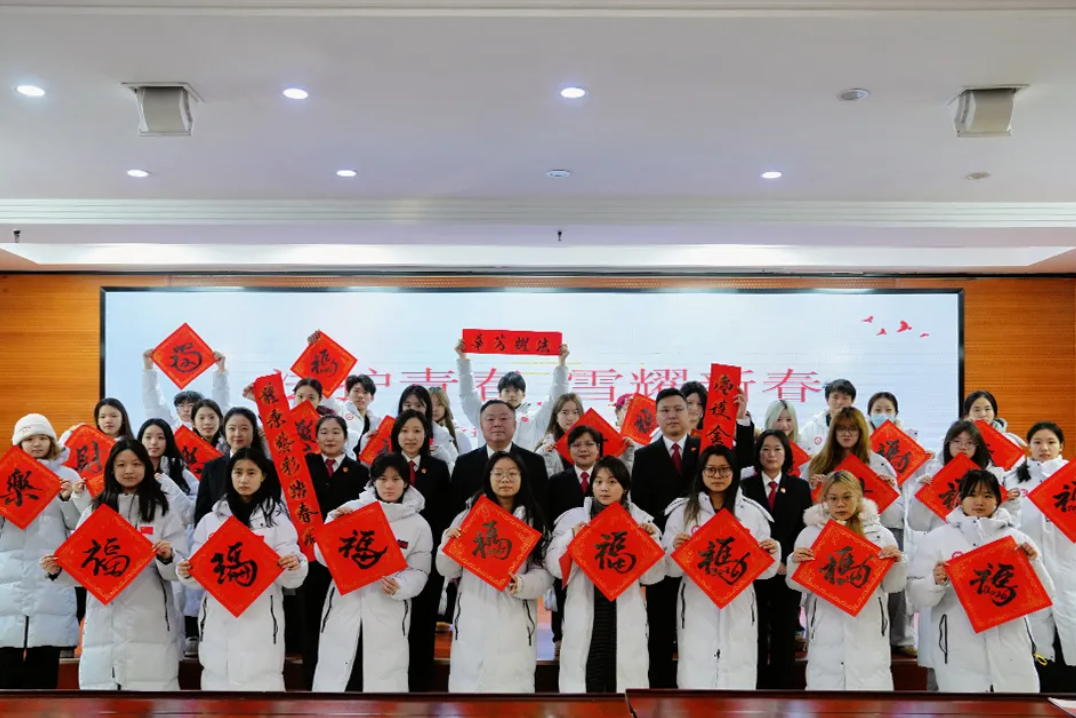 “雪耀新春圆国梦,法护青春育栋梁”——这副即兴创作的对联,成为当天最特别的礼物。同学们手持福字与法官合影,笑容灿烂。