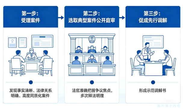 南岗区人民法院受理案件后,发现该批案件事实清晰、法律关系明确、高度同质化,具备“示范调解+系列化解”条件。知识产权审判庭首先选取两件典型案件组织公开庭审,法官准确把握争议焦点,多次释法明理,最终作出示范调解,形成示范调解书。