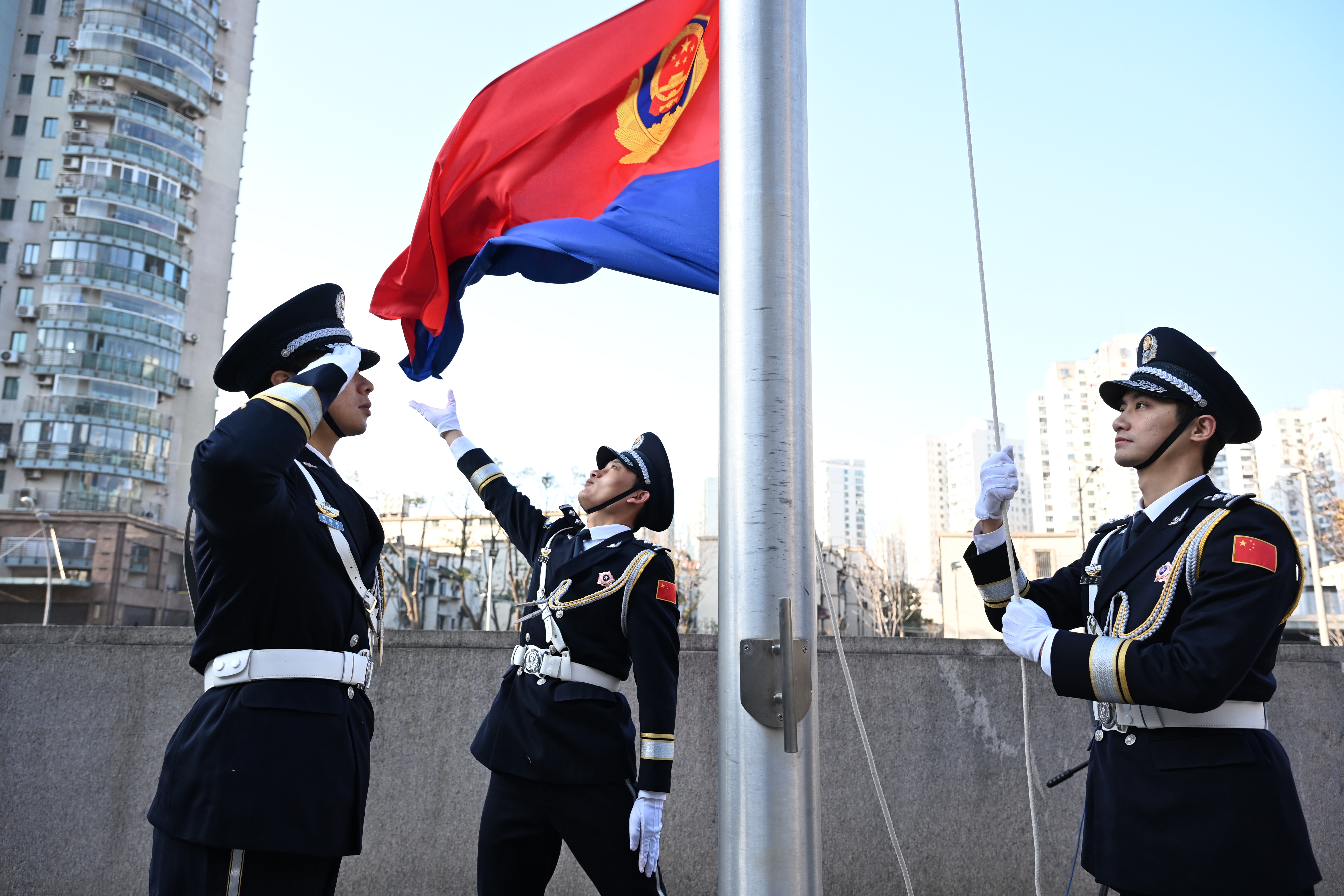 上午九时,上海市公安局办公指挥大楼前,仪仗队队员护送警旗缓缓走向旗杆。“升警旗,奏唱警歌!”公安民警代表身着警礼服,身姿挺拔、昂首肃立,向冉冉升起的警旗致以崇高敬礼,激昂的警歌在广场上空久久回荡。警旗猎猎飘扬之下,2025“感动上海”年度人物、浦东公安分局梅园新村派出所副所长姜经纬高举右拳,以洪亮的声音带领全体民警重温入警誓词。铮铮誓言铿锵有力、掷地有声,彰显着忠诚履职的坚定信念与守护平安的责任担当。