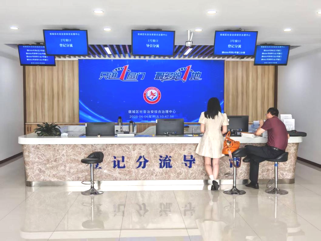 走进江苏省宿迁市宿城区综治中心,大厅功能分区清晰,法律咨询、劳动争议、家事纠纷等开放式服务窗口一字排开,群众在接待区登记后,可被精准分流至对应的职能部门窗口办理。