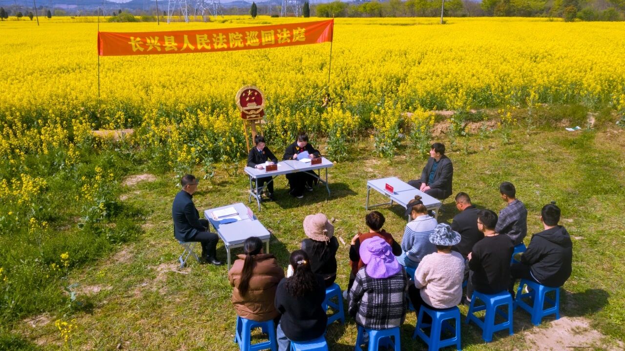 黄萼裳裳,花香满溢。今年春天,随着法槌的敲响,一场涉农用无人机作业的侵权纠纷巡回审判在泗安的花田下进行,几十名村民和部分农业专家现场旁听。