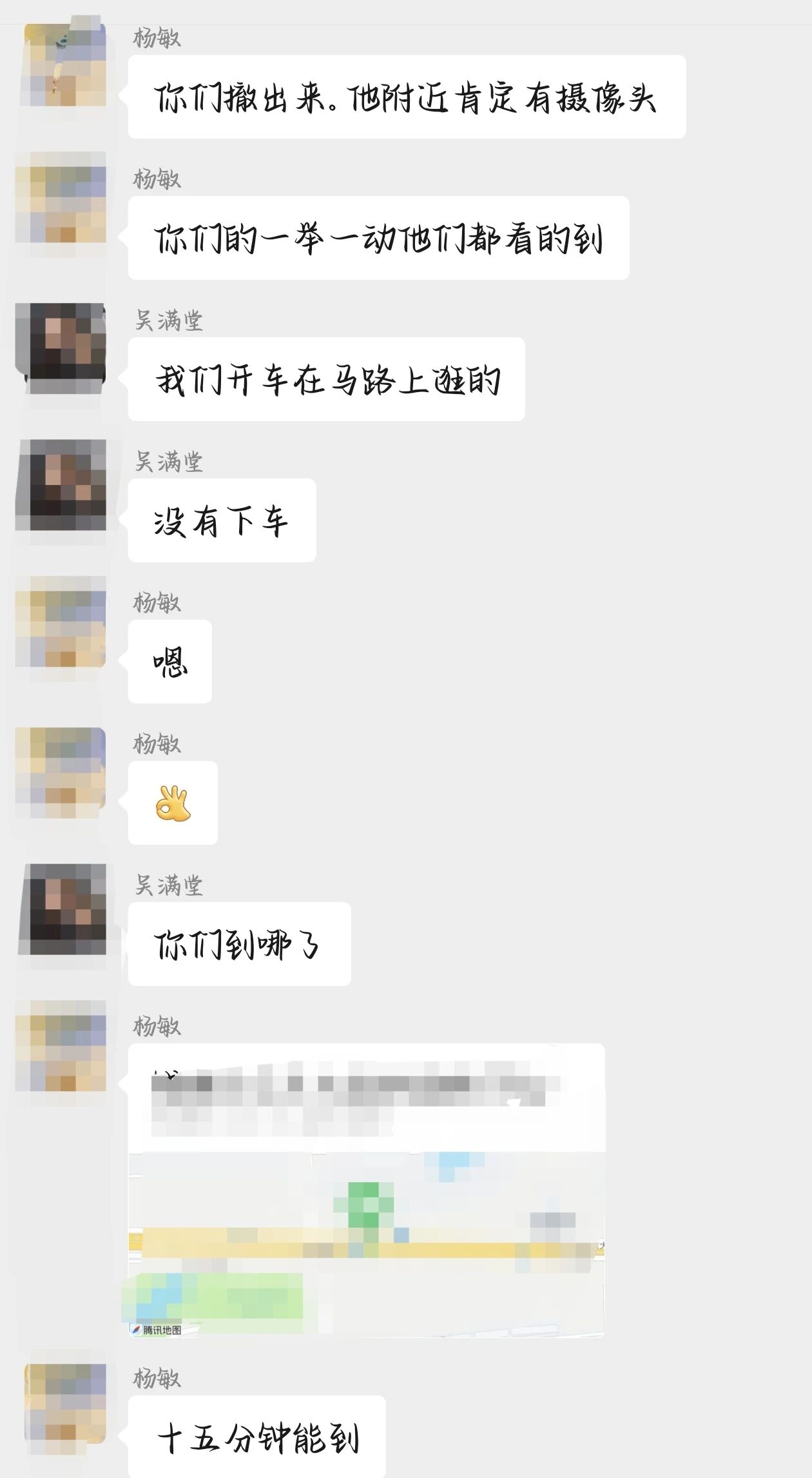 杨敏照做后,就往回走,离开了现场。走了几步路,她发消息给埋伏在不远处的同事说:“你们不要靠太近,保持一定距离。”