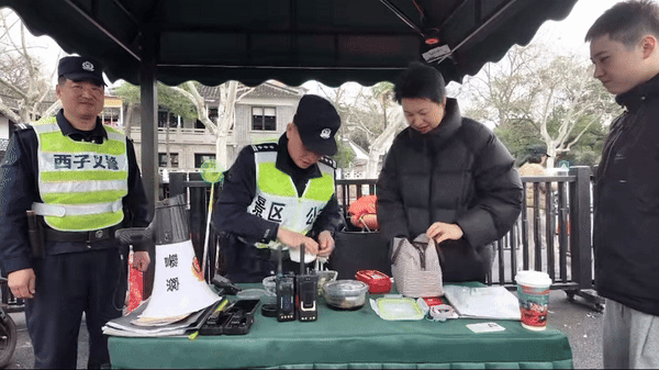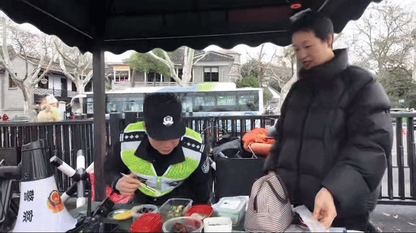 中午时分,客流迎来短暂平缓,陈宗耀正靠在岗亭旁喝水休息,“断桥小白”则在一旁待命。就在这时,一个熟悉的身影出现在岗亭不远处——妻子徐小丽和女儿一起,正朝着他挥手:“爸爸,我们给你送午饭啦!”