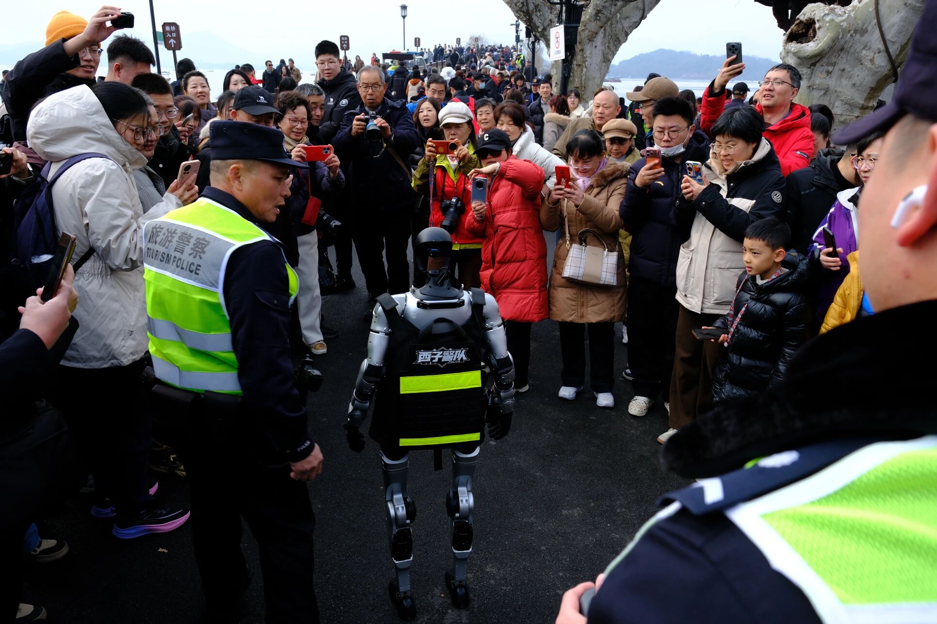 当天上午十点,老陈和同事们正在人流中穿梭疏导,一阵轻柔的机械运转声和游客的惊喜欢呼从身后传来,一位圆头圆脑的人形机器人,身着定制款“西子警队”执勤马甲,稳步走向陈宗耀,主动开口问好:“陈警官新年好!我是新来的同事,今天向您报到!”