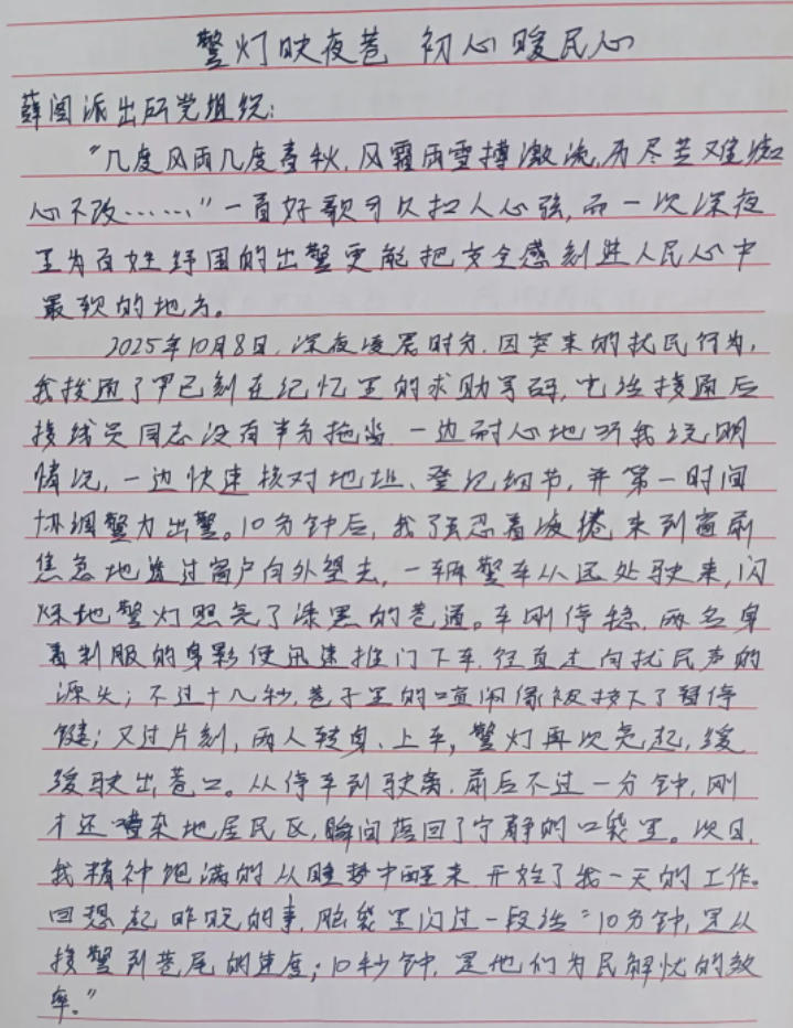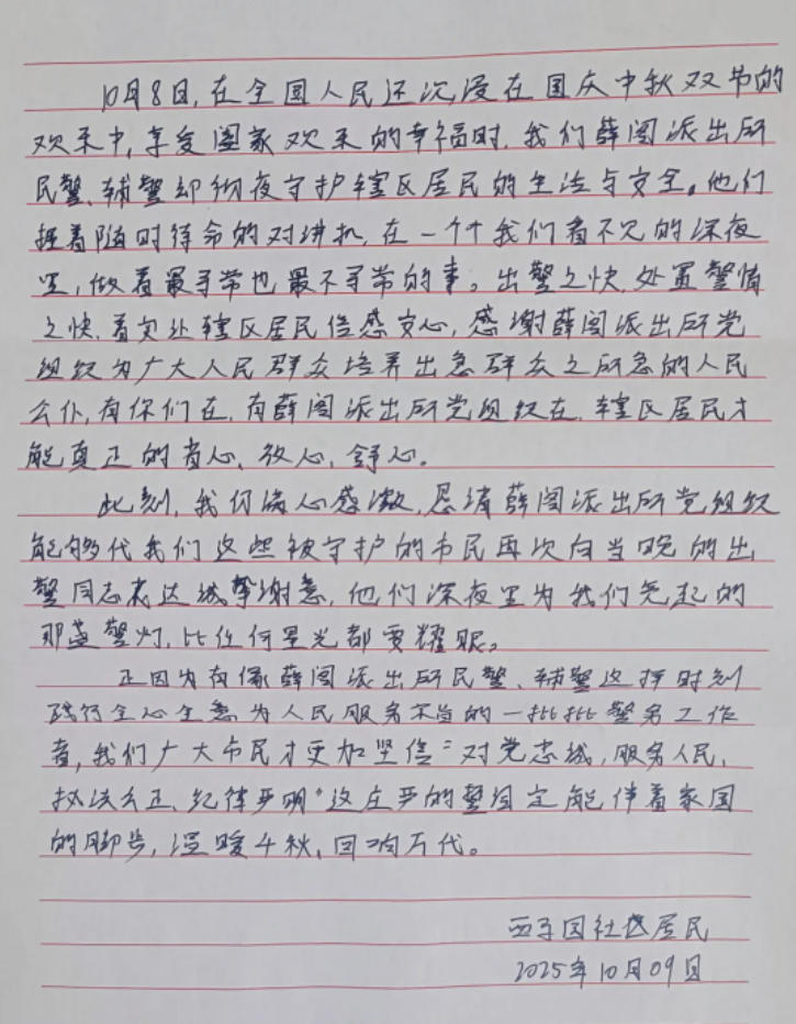 信的落款没有姓名,只有一行朴素的字迹:“西马园社区居民”。展开信纸,一段温暖的警民故事在字里行间流淌,将民警带回那个万籁俱寂的深夜——