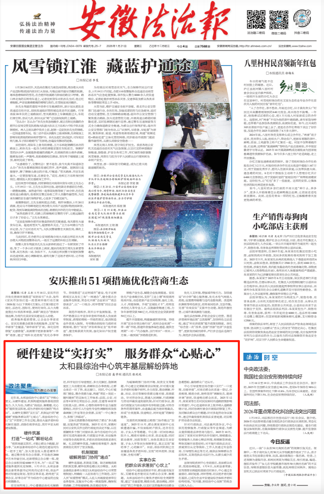 近年来,安徽阜阳太和县综治中心紧扣“实”字核心要义,从硬件建设、机制构建到服务落地层层发力、久久为功,为群众“找说法、解难题、化心结”提供坚实阵地,成为矛盾纠纷化解的“终点站”。从硬件支撑的“实打实”、机制运行的“硬碰硬”到服务群众的“心贴心”,该县综治中心以“实”字贯穿工作全过程,推动大量矛盾纠纷化解在基层、消除在萌芽状态,筑牢平安太和建设根基。