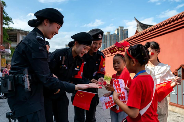 台湾路上,商铺林立,烟火气十足。女警们踏着斑驳的石板路巡逻,不时用闽南语与路边晒太阳的阿婆亲切打招呼,与熟悉的商户微笑点头。守护这条千年古道的热闹与宁静,是她们每一天的承诺。