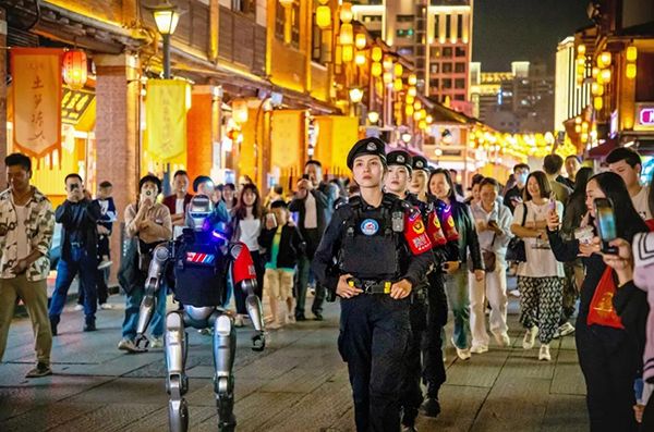 “北广场入口拥挤,请注意绕行!”面对国庆假期暴增的人流,女警们利用警用无人机高空巡查、喊话疏导。在地面,警用机器狗“小飒”和众擎智能巡逻机器人配合巡逻,形成“空地一体、点面结合”的智慧防护网。