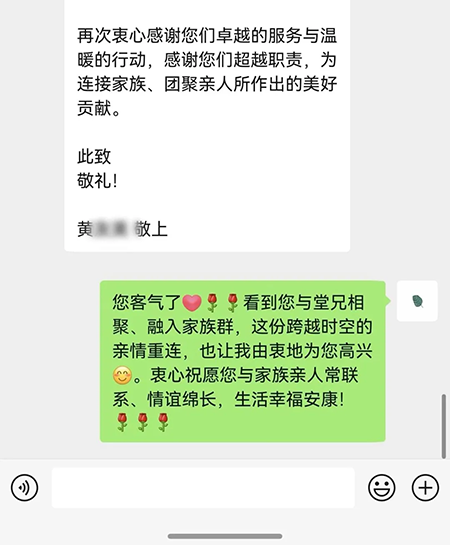 “多亏了你们的努力,我有幸与两位年长的堂兄见面......这种跨越时空、重建亲情的感动,让我终生难忘,再次衷心感谢你们!”就在黄女士即将离开莆田的那天,她通过微信给民警张昀发去了一段留言,字里行间承载着深深的感激,也为这次跨越万里的寻亲,画上了温暖的句号。