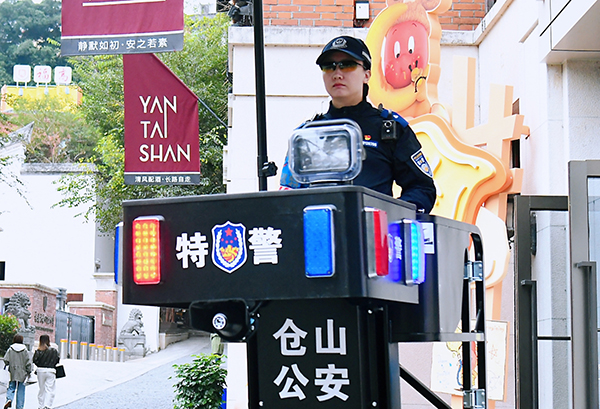 烟台山警务站“烟岚”女子机动队在升降瞭望台定点值守