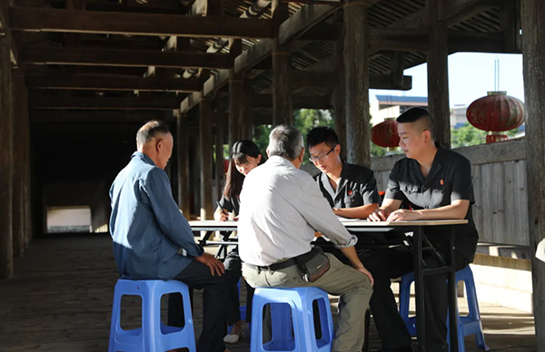 宁德市屏南县人民法院干警在千乘桥上的开展调解工作