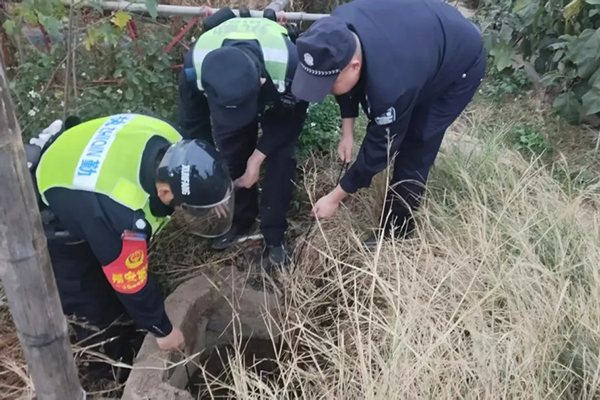 接到报警后,凤翔派出所立即启动应急处置预案,综合指挥室同步调度外勤巡逻队员增援。仅用3分钟,民警陈彦旭便带领辅警黄佳文等人携带救援装备抵达现场。到了现场,陈彦旭和同事拨开荒草,一口深约3米的荒井赫然在目。