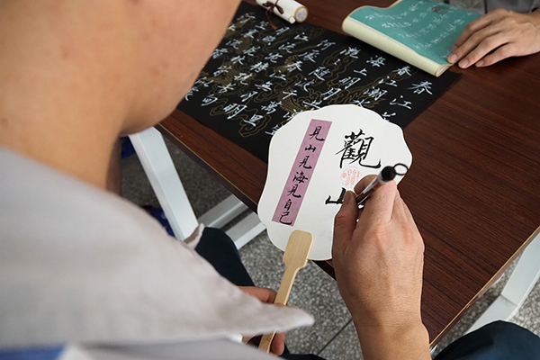 服刑人员在进行书法作品创作