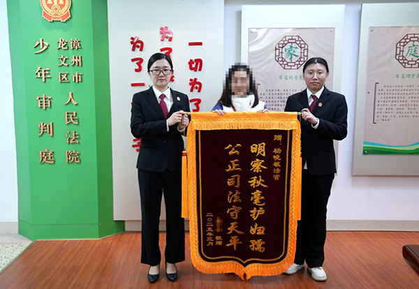 龙文法院家事少年审判庭收到当事人送来的写有“明察秋毫护妇孺 公正司法守天平”的锦旗