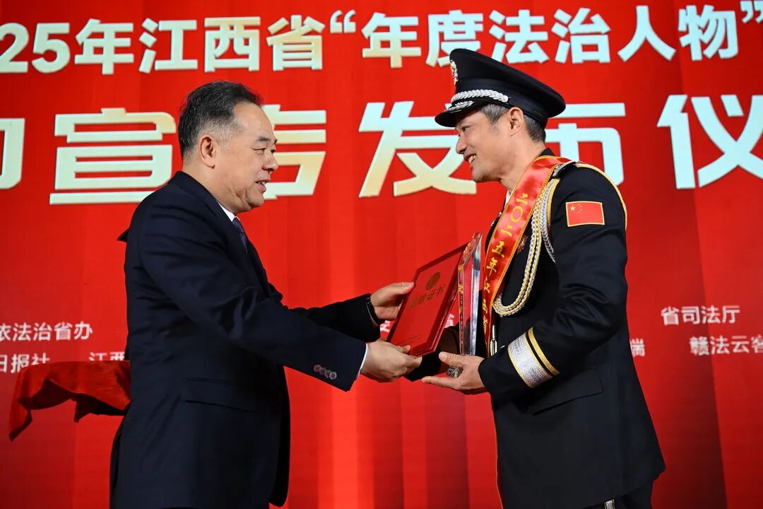 1月5日,2025年江西省“年度法治人物”集中宣传发布仪式在江西日报社举行。江西省委副书记、省委政法委书记陈永奇出席并为获奖者颁奖。江西省领导罗小云、袁勤华、陈俊卿、傅信平、丁顺生一同出席并颁奖。