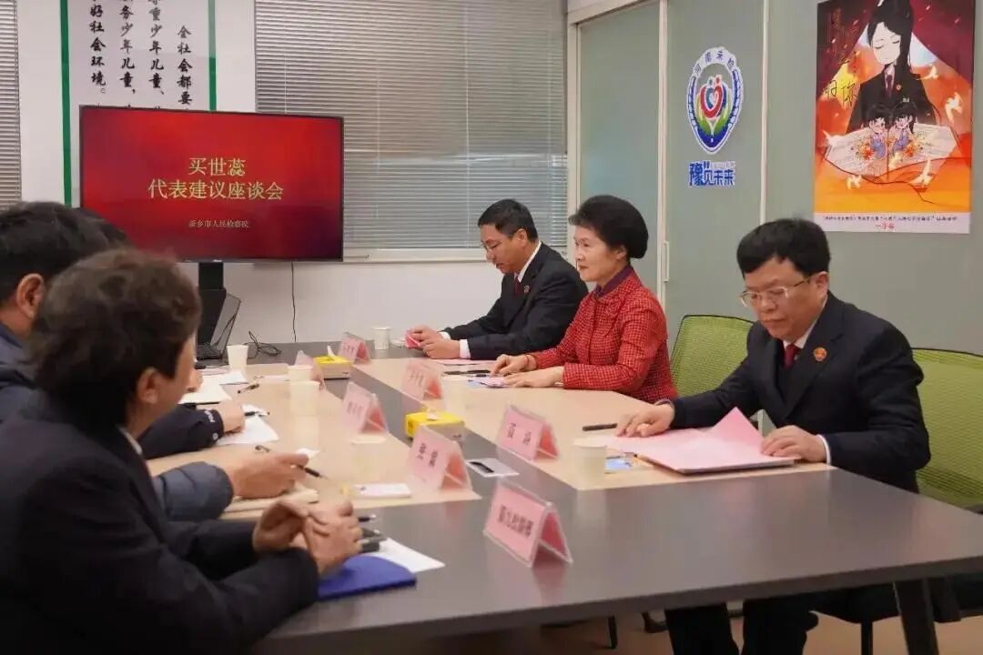 买世蕊代表(右二)在河南省新乡市检察院“‘豫’见未来·买世蕊小荷工作站”,同检察、公安、教育等“小荷”成员单位的相关负责人研讨未成年人合法权益保护工作。