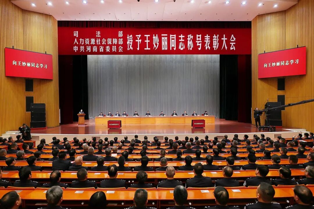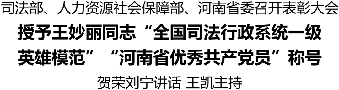2月4日,司法部、人力资源社会保障部、河南省委在郑州召开表彰大会,授予王妙丽同志“全国司法行政系统一级英雄模范”、“河南省优秀共产党员”称号。司法部党组书记、部长贺荣,省委书记刘宁出席并讲话。省长王凯主持。